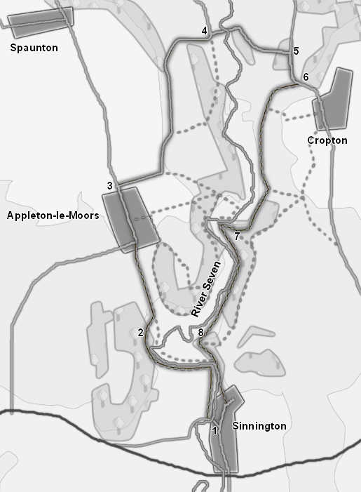 This walk explores the valley of the River Seven as it cuts through the Tabular Hills, and takes us from the southern edge of the National Park almost to the edge of the open moors. On the way we visit two very different villages - Sinnington, with its large village green, and Appleton-le-Moors, stretched out along a single long street, and use part of the Tabular Hills Regional Trail.